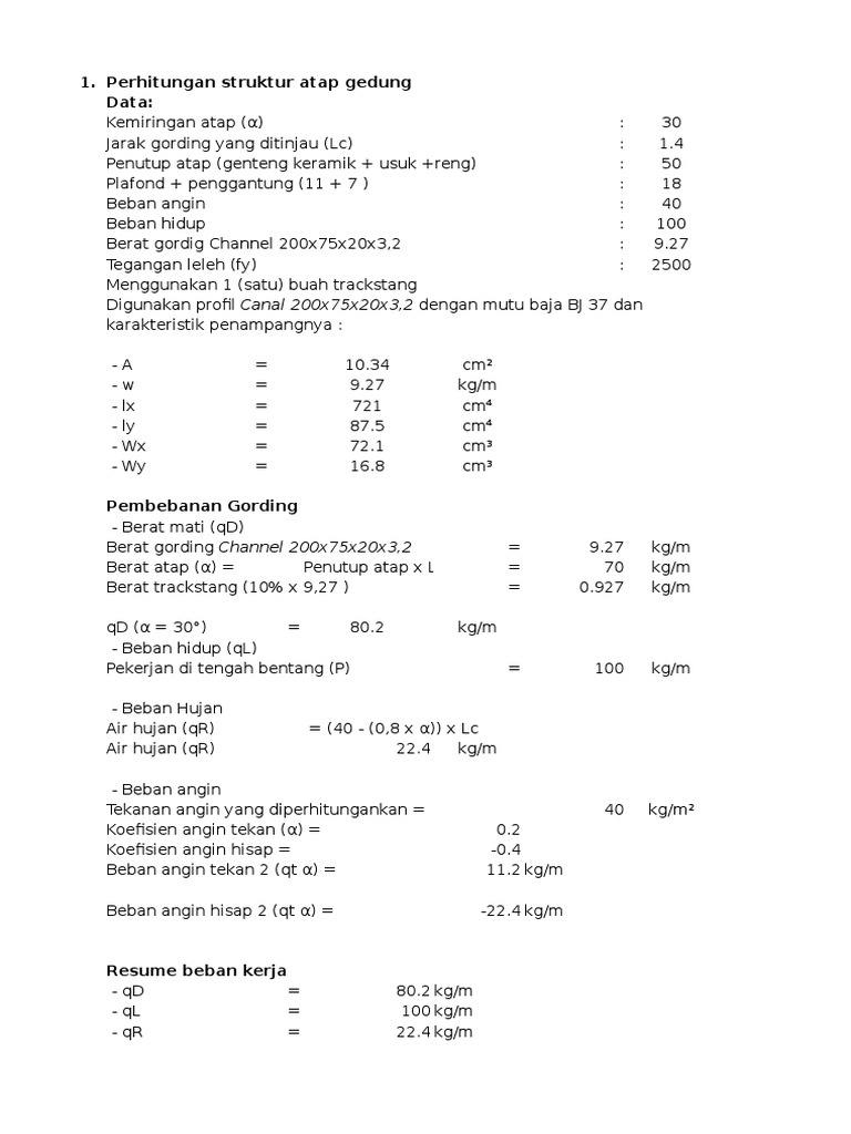 30 11 2022 Pada kondisi seperti itu menurut peraturan beban lama maka spesifikasi beban hidup yang diperlukan ialah akibat beban air hujan besarnya ialah maksimum 20 kg m2 atau 0 2 kN m2 merata pada keseluruhan luasan atap Beban hidup berupa air hujan itulah yang biasanya menentukan dimensi profil baja yang bagi dipilih